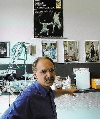 Die Zusammenarbeit mit den Spezialabteilungen ist eng. Allgemein zähle Fechten aber zu den verletzungsarmen Sportarten. Schnittverletzungen gibt es kaum, erzählt der Mediziner, der selbst leidenschaftlich Höhenbergsteigen und Tauchen geht. „Ich selbst bin verletzungsfrei geblieben in meiner Karriere”, sagt der 58-Jährige und klopft mit der rechten Hand auf seinen Schreibtisch.