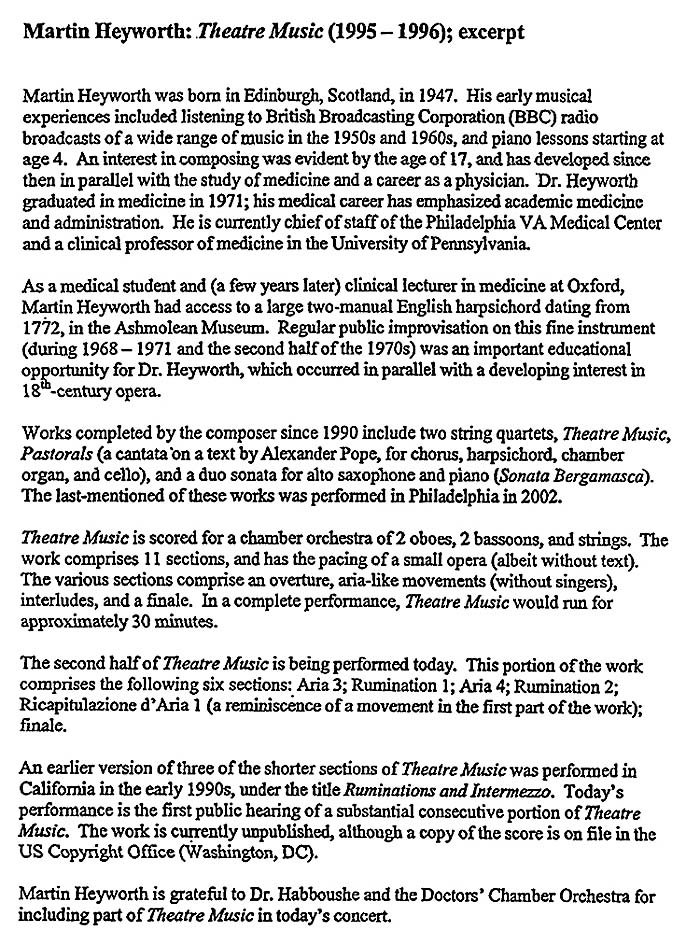 Martin Heyworth ist ein Arzt, der sein Stück „Theatre Music“ (1995-1996) mit dem Philadelphia Ärzteorchester aufgeführt hat. Seine Symphonie wurde mit einem professionellen Orchester in Philadelphie aufgeführt. Er ist im Board des Penn Med Symphony Orchesters PMSO.