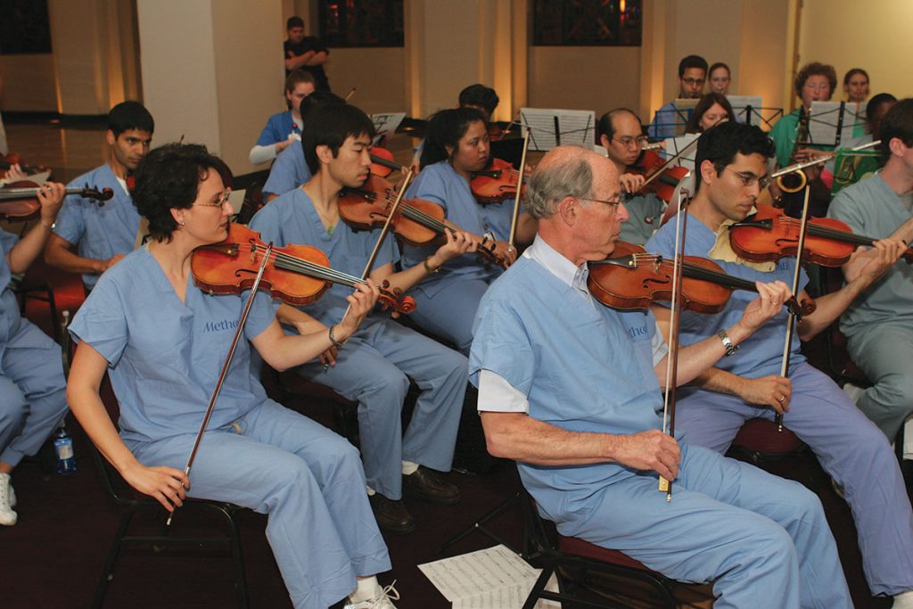 80 Mitglieder des Texas Medical Center Orchestra, Ärzte, Pflegekräfte, Medizinstudenten, Wissenschaftler, Zahnärzte, Therapeuten und Forscher, die ihre Liebe zur Musik teilen. Manchmal erscheinen sie im Kittel zu den Proben.